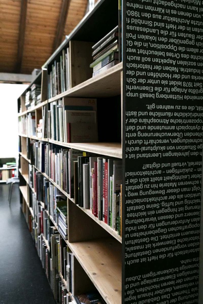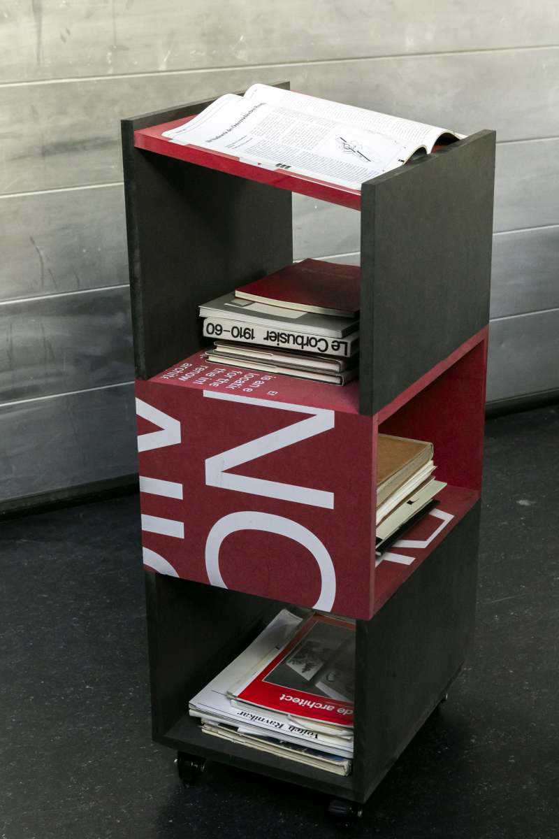 Die neuen Bücherregale wurden aus nicht mehr genutzten Platten und Beständen von bedruckten Ausstellungsmaterialien vom Architektur Haus Kärnten gebaut. Besonders die schwarz gefärbten MDF Platten der Ausstellung „Günther Domenig:DIMENSIONAL“ sind kreativ in Bücherregalen und dem mobilen Bücherturm verarbeitet.