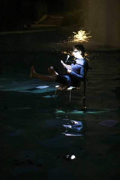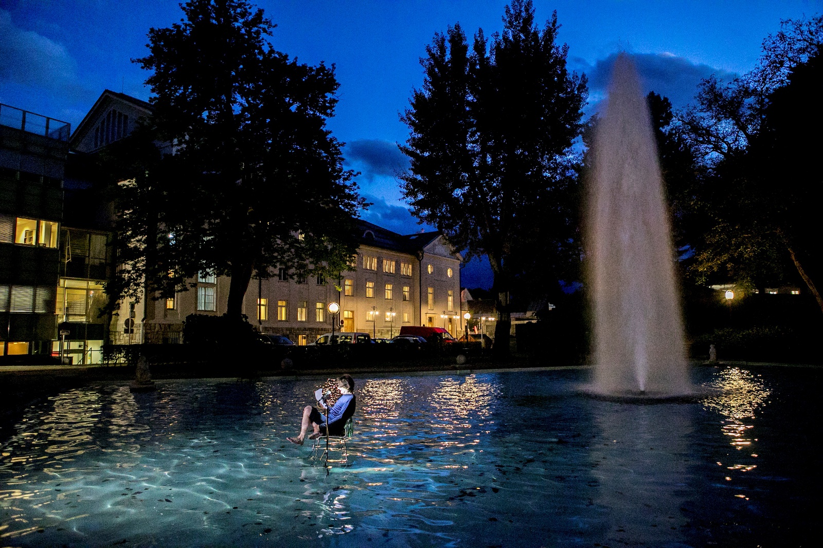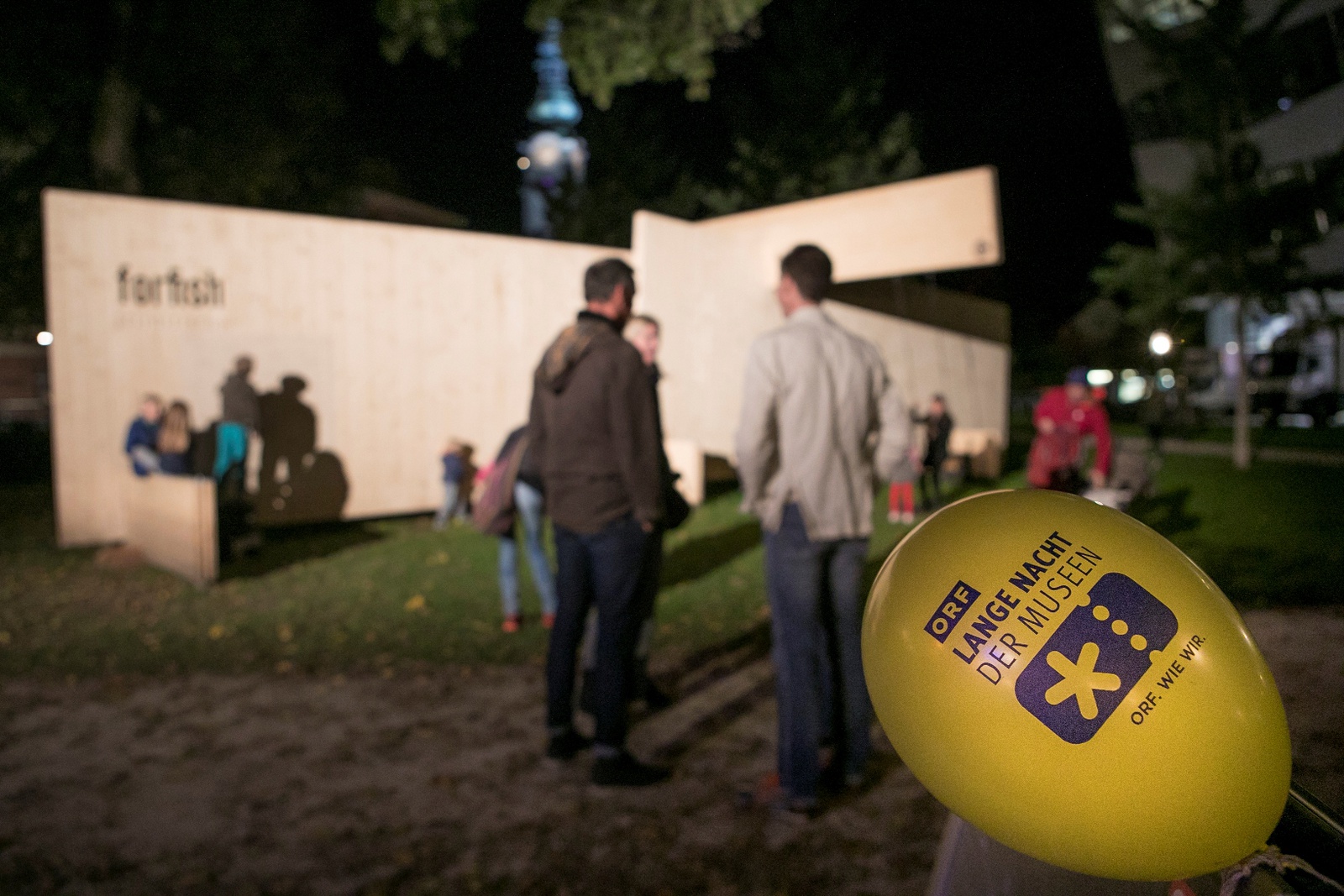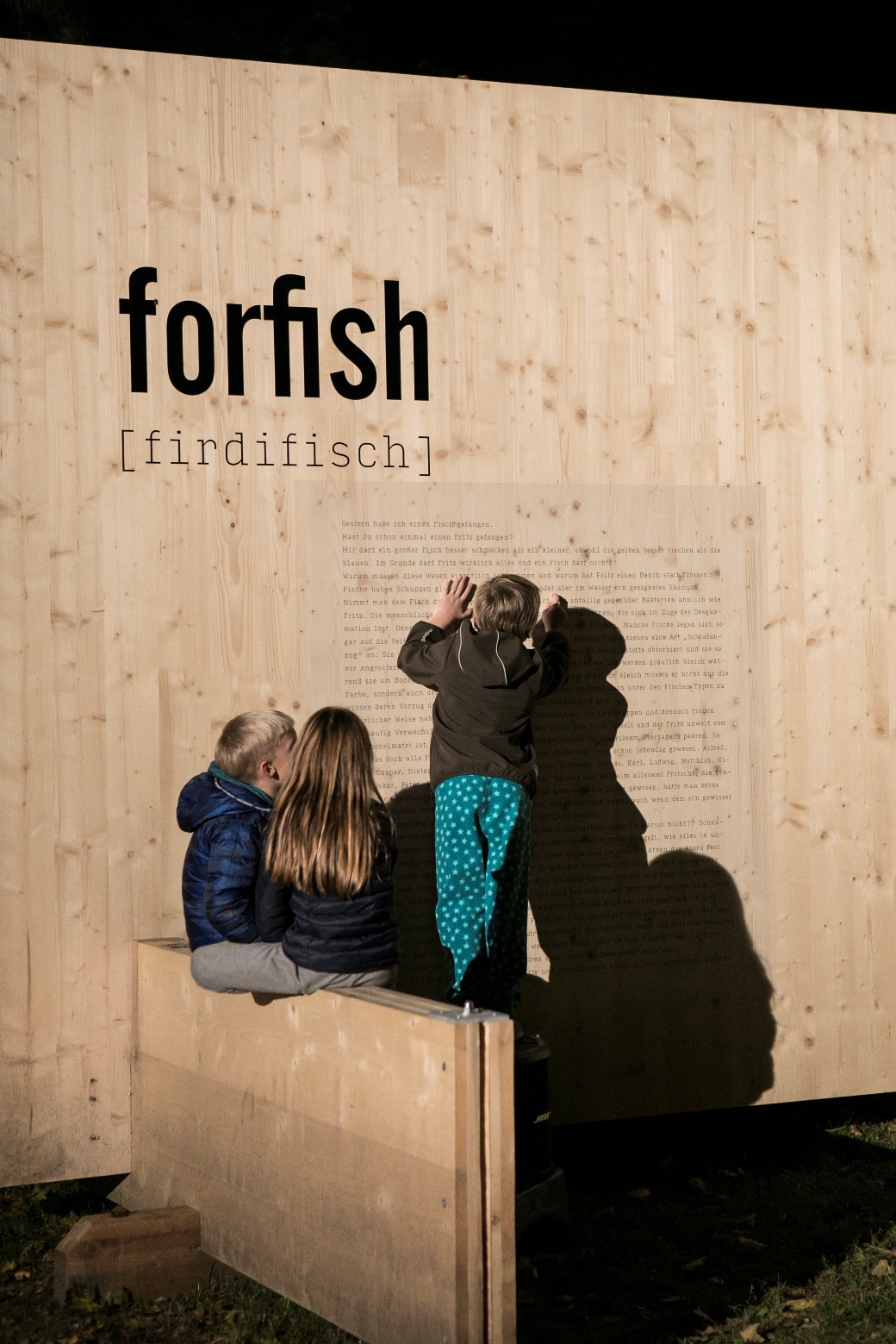 Um die 800 BesucherInnen bewegten sich während der ORF Langen Nacht der Museen zwischen der Installation FOR FISH und der Ausstellung vom Holzbaupreis Kärnten 2019. Die Installation der beiden Holzplatten wurde mit einer szenischen Lesung zum Leben erweckt. Der Schauspieler und Performance Künstler Rudolf Widerhofer las die Geschichte vom Fritz und vom Fisch in unterschiedlichen Facetten. Sitzend im Wasser vom Goetheparkbrunnen stellte er eine Verbindung zwischen dem Wasser und der Installation her.