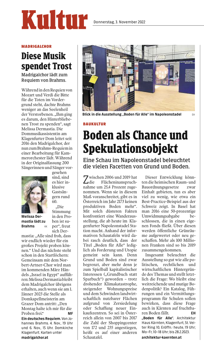 Zwischen 2006 und 2019 hat die Flächeninanspruchnahme um 25,4 Prozent zugenommen. Wenn sie in diesem Maß voranschreitet, gibt es in Österreich im Jahr 2173 keinen produktiven Boden mehr“. Mit solch düsteren Fakten konfrontiert eine Wanderausstellung, die ab heute im Klagenfurter Napoleonstadel Station macht. Anhand der informativen Schautafeln wird dabei rasch deutlich, dass der Titel „Boden für Alle“ lediglich als Forderung und Utopie gemeint sein kann. Denn Grund und Boden sind zwar begrenzt, aber mehr denn je zum Spielball kapitalistischer Interessen („Grundbuch statt Sparbuch“) geworden – trotz drohender Klimakatastrophe, steigender Wohnungspreise und dem Schwinden landwirtschaftlich nutzbarer Flächen aufgrund von Zersiedelung oder Schaffung neuer Einkaufszentren. So sei in Österreich allein von 2007 bis 2017 die Zahl der Shoppingcenter von 172 und 235 angestiegen, heißt es auf einer anderen Schautafel.