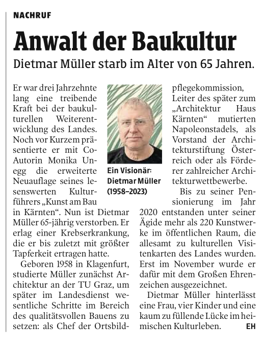 Er war drei Jahrzehnte lang eine treibende Kraft bei der baukulturellen Weiterentwicklung des Landes. Noch vor Kurzem präsentierte er mit Co-Autorin Monika Unegg die erweiterte Neuauflage seines lesenswerten Kulturführers „Kunst am Bau in Kärnten“. Nun ist Dietmar Müller 65-jährig verstorben. Er erlag einer Krebserkrankung, die er bis zuletzt mit größter Tapferkeit ertragen hatte.