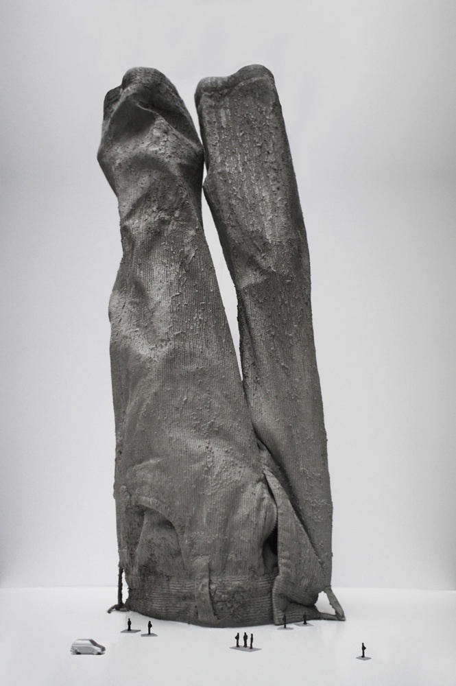 Ich habe es geliebt mich zu verkleiden, die Schuhe meiner Mutter anzuziehen, möglichst die mit dem größten Absatz, oder in einen Mantel zu schlüpfen, der zum Zelt wird, in dem man verschwinden kann. Vielleicht sind es diese Erinnerungen, die uns bewogen haben, aus Kleidern eine Raumlandschaft zu modellieren, in der man sich einrichten, verschwinden, träumen und entdecken kann. Darüber hinaus haben wir mit unterschiedlichen Betonmischungen experimentiert, um die textile Haut in ihrer Organik einzufrieren. Eine dritte Haut zwischen Landschaft und Raum, hart und weich …“ (the next ENTERprise – architects)