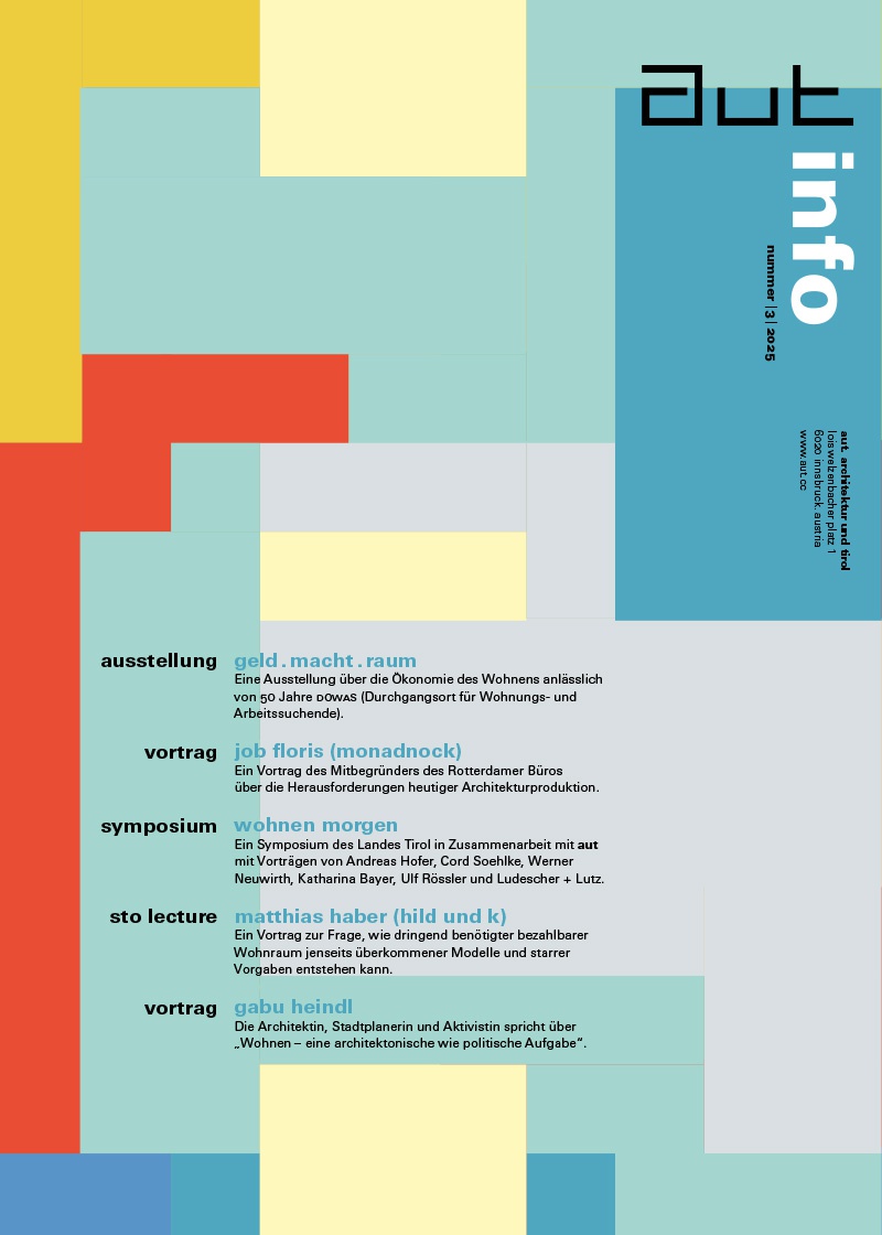 In der aut: info 3/25 finden Sie Hintergrundinformationen zu dieser Ausstellung sowie zu all unseren Veranstaltungen bis Feber 2026, die sich passend zur Ausstellung schwerpunktmäßig mit den vielfältigen Aspekten des Wohnens auseinandersetzen. So finden Vorträge der Architekt:innen Gus Tielens (Korth Tielens), Job Floris (Monadnock), Matthias Haber (Hild und K) und Gabu Heindl statt, ein Live-Podcast zum Thema Wohnungsnot und Kapitalismus sowie das Symposium "Wohnen Morgen".