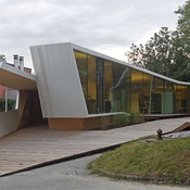 Entstanden ist ein pavillonartiges Werkstättengebäude, das nicht nur den Kindern und Jugendlichen als NutzerInnen ein optimales Raumangebot bietet, sondern auch den Park durch seine einzigartige Architektur bereichert. Vorgelagerte Terrassen und raumhohe Glasfronten verbinden den geschwungenen Baukörper mit der Umgebung, im Inneren bilden schräge Böden und Wände ein fließendes Kontinuum an Räumen mit unterschiedlichen Atmosphären und Arbeitsmöglichkeiten.