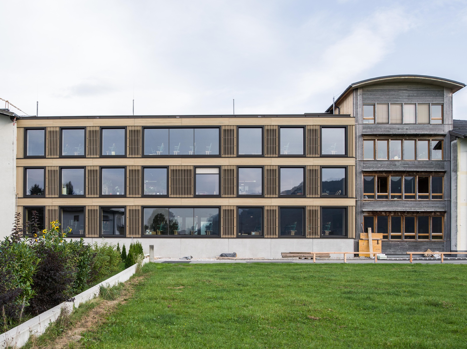 Auf dem Weg in den Pongau besuchen wir den weit gediehenen Umbau des Holztechnikums (HTK) in Kuchl. In moderner Brettsperrholz-Bauweise errichtet, ergänzt der Neubau den über Jahrzehnte gewachsenen Schulkomplex um eine zeitgemäße Facette. In Pfarrwerfen begegnet uns in „St. Cyriak“ ein Wohnhaus für ältere Menschen, das handwerklich feingliederig ausgeführt, harmonisch in den dörflichen Charakter des Ortes integriert ist. Zu Mittag – verbunden mit einer kleinen Pause – besichtigen wir den neuen Lebensmittelmarkt im Zentrum von St. Martin, der durch seine Materialien – Holz und Beton – und seine markante Tektonik den Ortscharakter prägt. Die sensible Aufgabe der Erweiterung eines historischen Friedhofes erwartet uns in Altenmarkt. Das in Sichtziegelbauweise ausgeführte Bauwerk besticht in jeder Hinsicht. Abschließend führt unsere Reise nach St. Johann, ins Zentrum für Inklusiv- und Sonderpädagogik. Mit Freiterrassen zur Salzach, stirnseitig angeordneten Loggien und nicht zuletzt einem lichtdurchfluteten Sportsaal im Obergeschoß bietet der kompakte Holzbau geschützte Räume für Kinder mit besonderen Bedürfnissen.