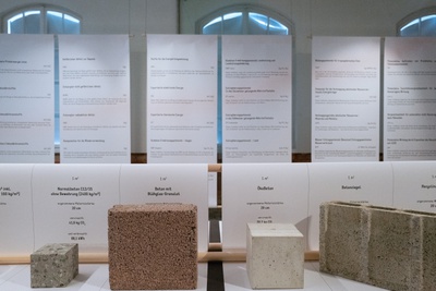 In der Ausstellung wird erstmals eine neu angelegte Sammlung an Werkstoffen präsentiert. In Zusammenarbeit mit der FH Salzburg und der bautechnischen Versuchs- und Forschungsanstalt startete die Initiative Architektur im vergangenen Jahr einen Forschungsprozess. Gesammelt wurden umweltrelevante Basisdaten von Werkstoffen in der Bauwirtschaft.