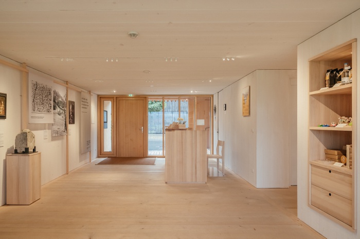 Der verbliebene Teil des Stadels wurde abgetragen und durch einen neuen, sieben Meter langen Baukörper ersetzt. Seine äußerliche Schlichtheit täuscht über die innere räumliche Komplexität hinweg. Öffnet man die einfache Holzschiebetüre, betritt man einen Kassen- und Veranstaltungsraum, von dem aus eine raffinierte Wegeführung den Neubau mit dem historischen Holzhaus verzahnt. Der Strickbau aus dem 16. Jahrhundert, mit niedrigen Räumen und verrußten Originalwänden, wird geschickt in einen Rundgang eingebunden, der schließlich in die weiß gekalkten, holzverkleideten Ausstellungsräume des Obergeschoßes führt. Auch hier gab es Debatten: Ist das Kalken von Holzwänden nicht Verschwendung? Nach intensiven Diskussionen entschied man sich dennoch dafür, da die Flächen so nach wechselnden Ausstellungen leicht erneuert werden können. Neben der Dauerausstellung im alten Haus bietet der Neubau nun Platz für Wechselausstellungen wie „Frauenarbeit und Stickerei im Wald“, oder „Foto Hiller. Bildgeschichte Bregenzerwald“. Für deren inhaltliche Konzeption wurden zusätzlich Fachleute für Museums- und Ausstellungsgestaltung beigezogen – bei dieser Projektgröße und den engen Budgetvorgaben ein bemerkenswerter Schritt.